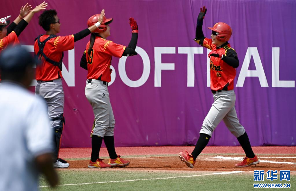 7月19日,中国队球员任敏(前)和队友庆祝打出本垒打。