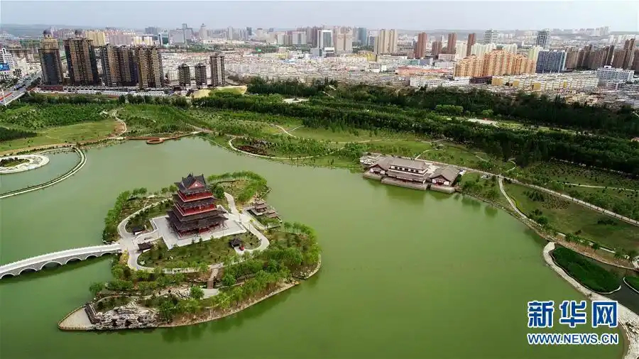 陕西省榆林市榆阳区河滨公园(2019年6月4日摄,无人机照片)。新华社记者 刘潇 摄