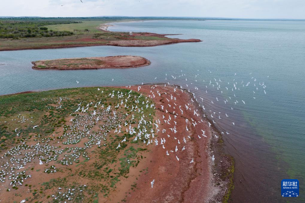 遗鸥在红碱淖国家级自然保护区湖心岛上空飞翔(2024年6月4日摄,无人机照片)。新华社记者 邵瑞 摄