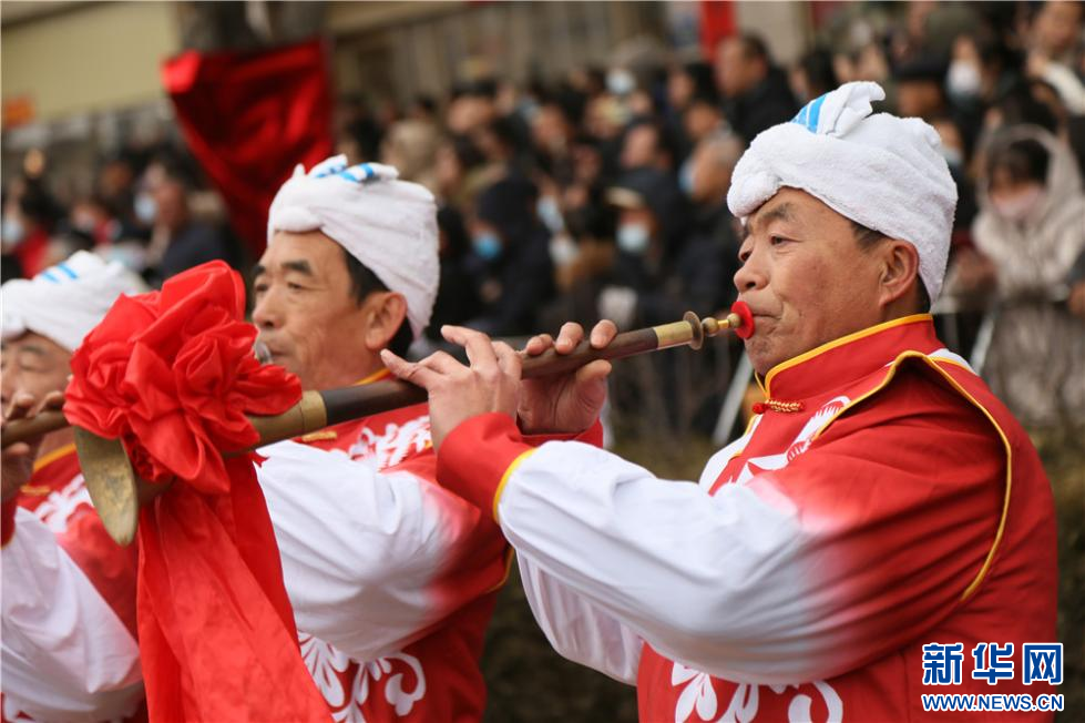 2月12日,米脂县秧歌队在街头为市民游客表演唢呐。新华网 王智超摄