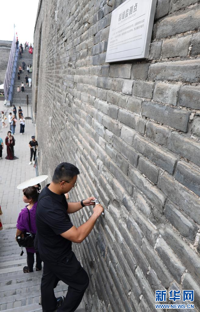 9月12日,游客在西安城墙永宁门内游览,左侧城墙上布设着墙体裂缝监测仪。