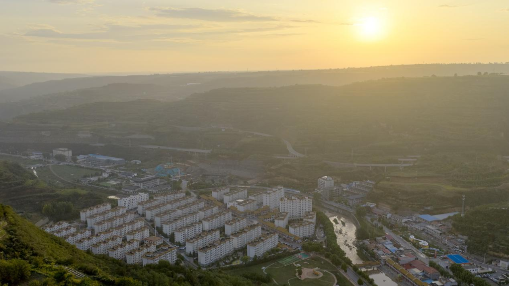 9月16日,一场秋雨过后,陕西省延安市黄龙县天空放晴,晚霞如约而至。随着无人机缓缓升空,独特的高空视角下,群山仿佛被洗涤过一般,山脚下的城区错落分布,与斑斓晚霞交相辉映。