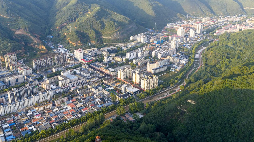雨后傍晚的陕西黄龙县城,霞光洒落在城市建筑与周边山峦之上。