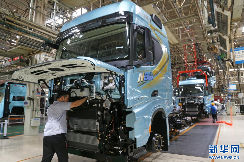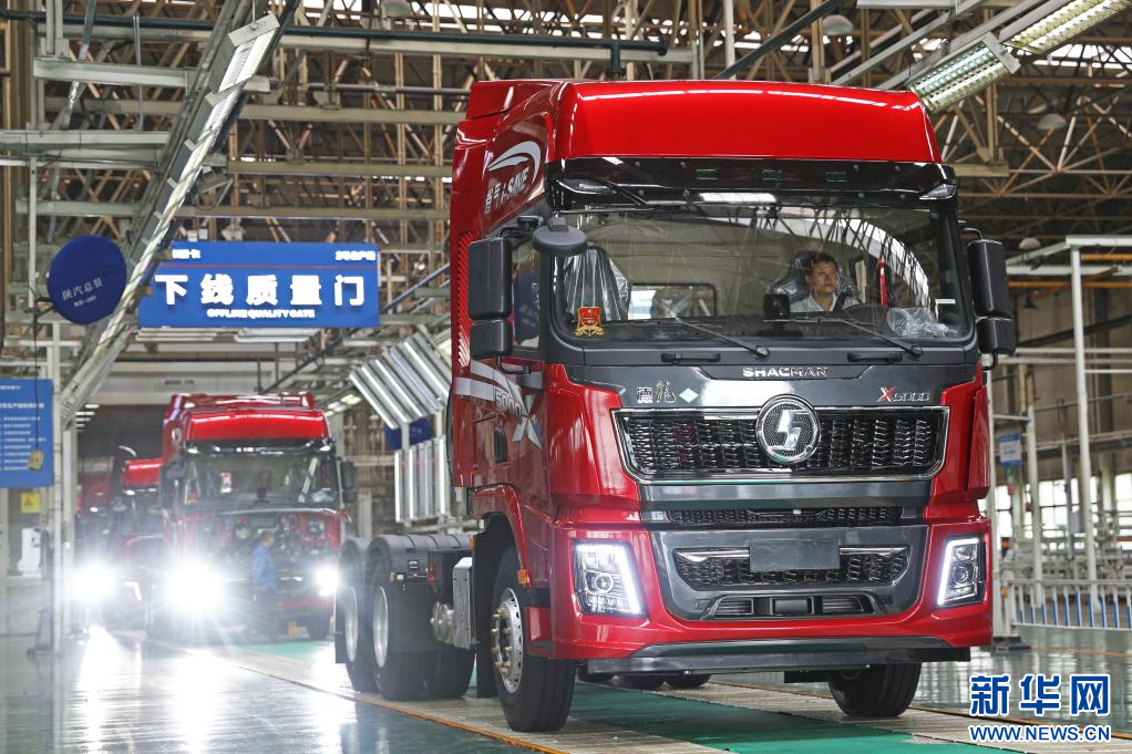 在陕西汽车控股集团有限公司汽车总装配车间,一辆装配完成的汽车下线驶出车间。新华网 王智超摄pagebreak