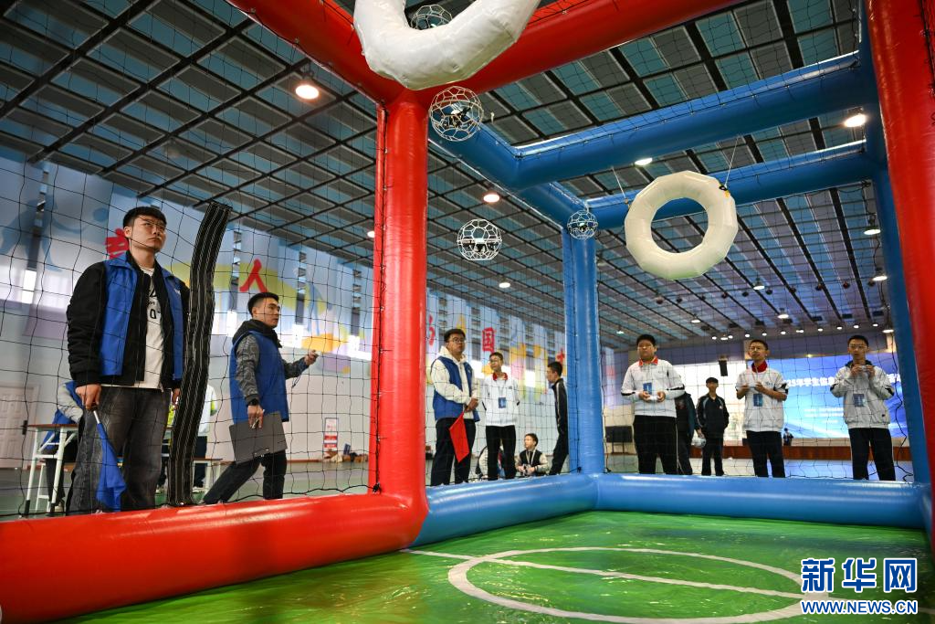 10月18日,学生在西安市新城区太华路小学参加多轴无人机足球对抗赛。