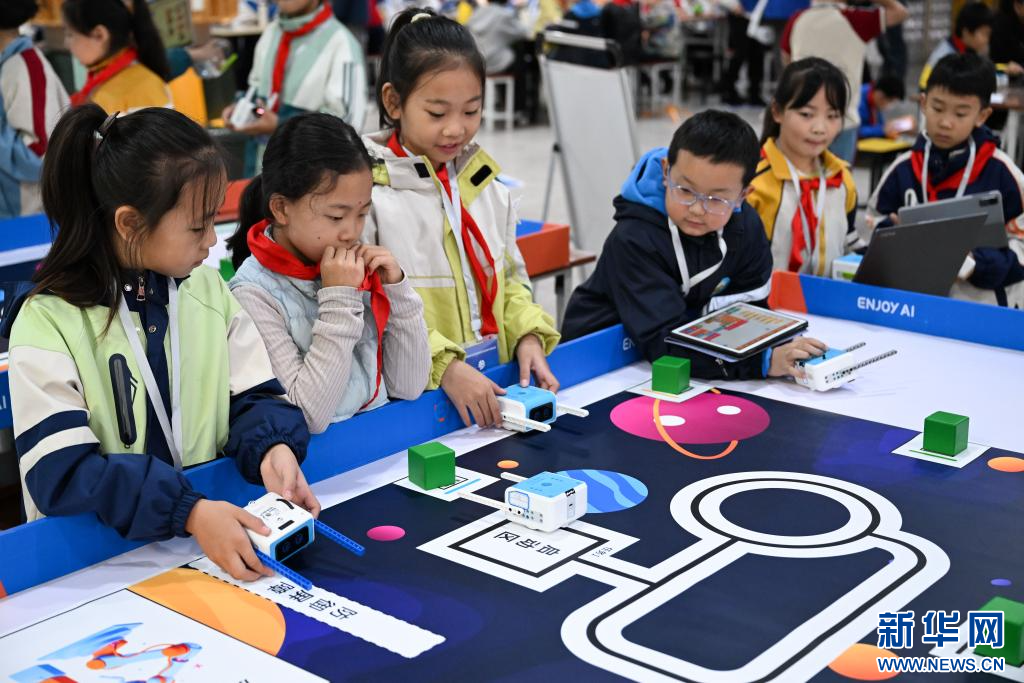 10月18日,学生在西安市新城区太华路小学参加人工智能创意编程挑战赛。