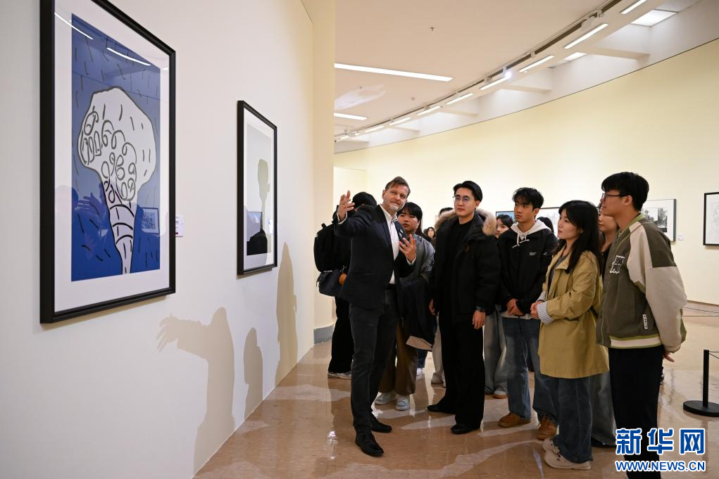 10月19日,参展嘉宾(左一)为参观者讲解艺术作品。
