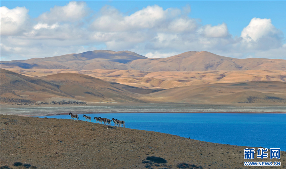 拉昂错前的几匹藏野驴。新华网 王智超摄