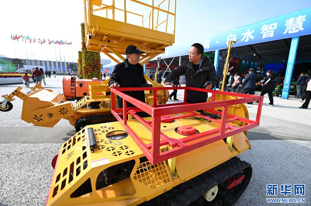 10月26日,参观者在第32届杨凌农高会上了解渭南君创飞科技有限公司的履带果园管理机。新华社记者 李一博 摄