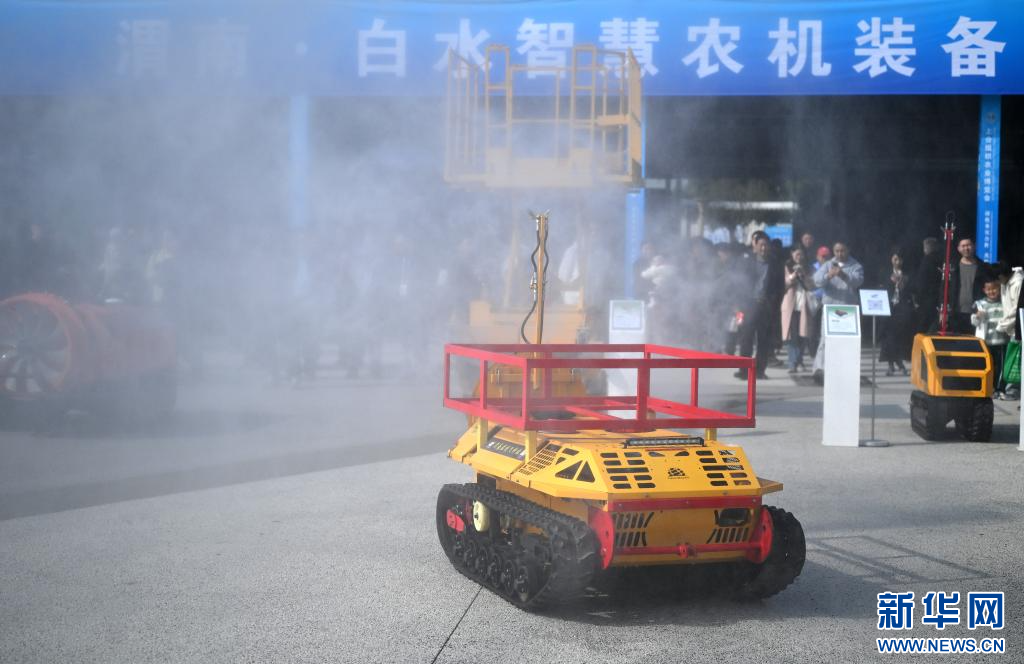 10月26日,渭南君创飞科技有限公司的履带自走式风送喷雾机在第32届杨凌农高会向参观者进行模拟演示。新华社记者 李一博 摄