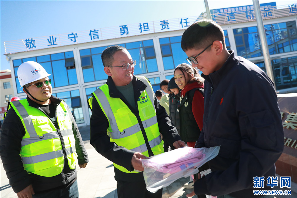于卫刚为当地藏族工人子女赠送学习用品。新华网 王智超摄pagebreak