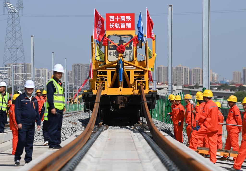 新華社照片,西安,2025年9月8日 9月8日,施工人員在西十高鐵西安東至藍(lán)田區(qū)間鋪設(shè)無(wú)縫鋼軌。