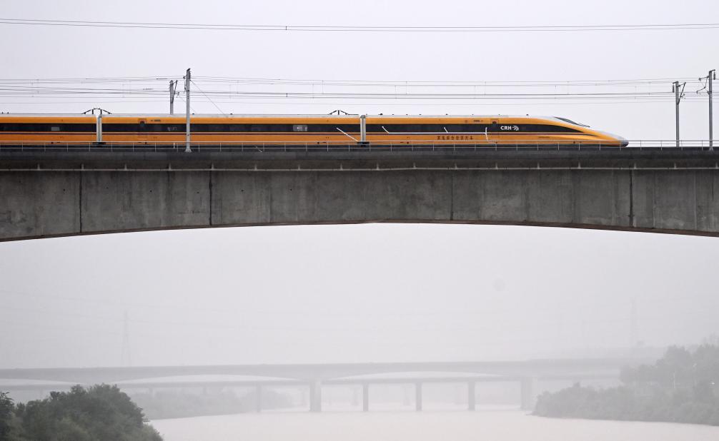 新華社照片,西安,2025年9月11日 9月11日,聯(lián)調(diào)聯(lián)試綜合檢測(cè)列車駛過(guò)位于陜西省西安市的西延高鐵渭河特大橋。
