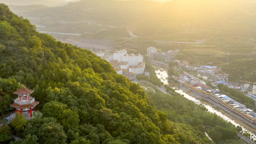 9月16日,一場(chǎng)秋雨過(guò)后,陜西省延安市黃龍縣天空放晴,晚霞如約而至。隨著無(wú)人機(jī)緩緩升空,獨(dú)特的高空視角下,群山仿佛被洗滌過(guò)一般,山腳下的城區(qū)錯(cuò)落分布,與斑斕晚霞交相輝映。