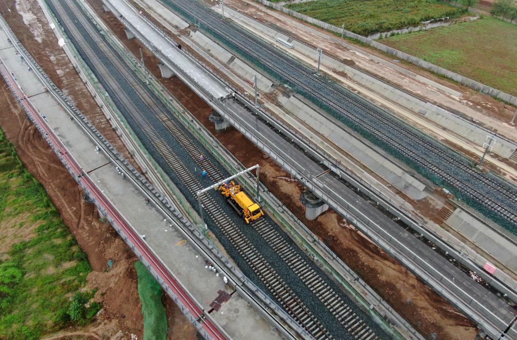 新華社照片,西安,2025年10月11日 10月11日,中鐵一局施工車輛在西康高鐵西安東站至牛背梁站區(qū)間鋪設(shè)無(wú)縫鋼軌(無(wú)人機(jī)照片)。