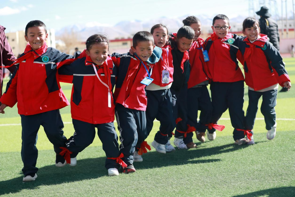 西藏阿里陜西實(shí)驗(yàn)學(xué)校的學(xué)生們正在操場(chǎng)進(jìn)行趣味運(yùn)動(dòng)會(huì)比賽,該校是陜西省在阿里援建的第一所標(biāo)準(zhǔn)化學(xué)校。